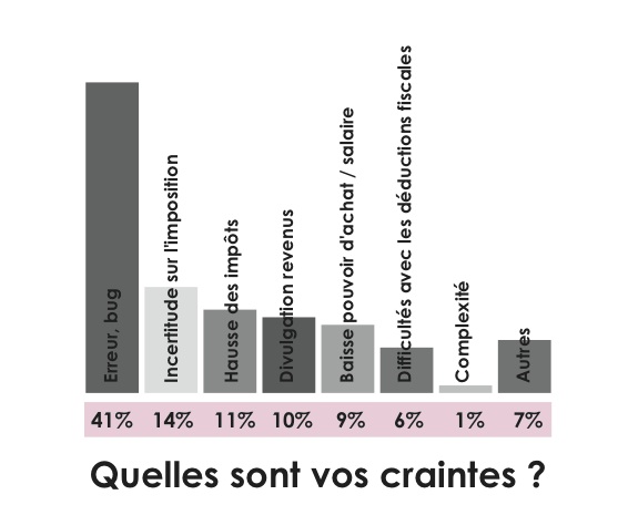 L’adhésion à cette nouveauté fiscale n’empêche pas les inquiétudes pour 53% des sondés. Les femmes à 79% et les personnes âgées de 35 à 49 ans, à 85%, déclarent redouter sa mise en place. Essentiellement, le panel relève les erreurs et autres bugs informatiques ou administratifs à 41%, les craintes de différentes natures arrivent loin derrière telles que la baisse du pouvoir d’achat (9%) et la divulgation des revenus du foyer à l’em- ployeur (10%). Après les incertitudes qui ont trouvé une résonance jusqu’au plus haut niveau de l’État, l’heure est à l’action pour l’ad- ministration fiscale et pour les contribuables qui peuvent rectifier leur taux d’imposition jusqu’à la fin du mois de novembre.
